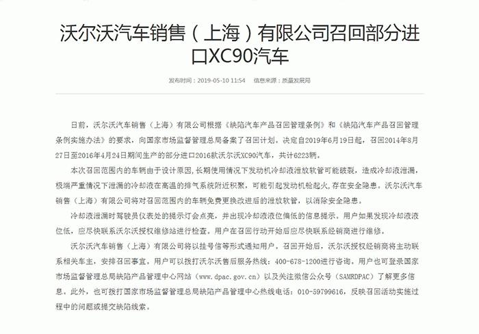 日前,沃尔沃汽车销售(上海)有限公司根据《缺陷汽车产品召回管理条例》和《缺陷汽车产品召回管理条例实施办法》的要求,向国家市场监督管理总局备案了召回计划。决定自2019年6月19日起,召回2014年8月27日至2016年4月24日期间生产的部分进口2016款沃尔沃XC90汽车,共计6223辆。本次召回范围内的车辆由于设计原因,长期使用情况下发动机冷却液泄放软管可能破裂,造成冷却液泄漏,极端严重情况下泄漏的冷却液在高温的排气系统附近积聚,可能引起发动机舱起火,存在安全隐患。沃尔沃汽车销售(上海)有限公司将对召回范围内的车辆免费更换改进后的泄放软管,以消除安全隐患。