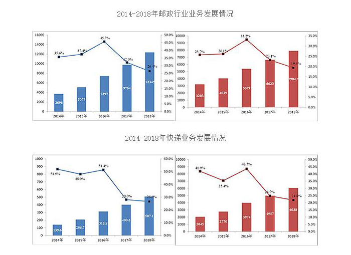 5月10日,国家邮政局发布《2018年邮政行业发展统计公报》。公报显示,2018年邮政行业业务总量完成12345.2亿元,同比增长26.4%,首次突破万亿元大关。全年邮政行业业务收入(不包括邮政储蓄银行直接营业收入)完成7904.7亿元,同比增长19.4%。其中,快递业务快速增长,全年快递服务企业业务量完成507.1亿件,同比增长26.6%。快递业务收入完成6038.4亿元,同比增长21.8%。快递业务收入占行业总收入的比重为76.4%,比上年提高1.5个百分点。快递业务量排名前五位的省份依次是广东、浙江、江苏、上海和北京,合计占全部快递业务量的比重达到65.4%。快递业务收入排名前五位的省份依次是广东、上海、浙江、江苏和北京,合计占全部快递业务收入的比重达到66.6%。