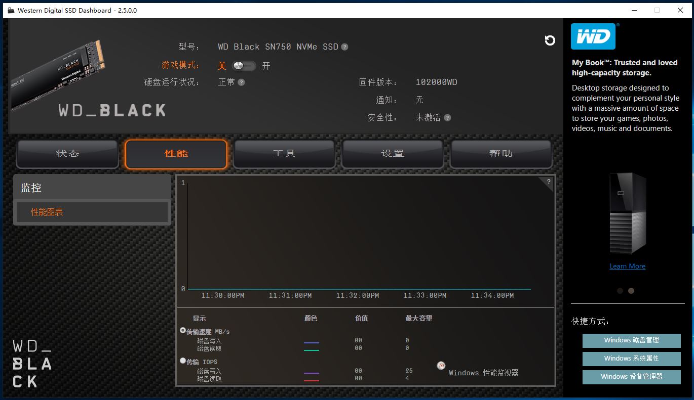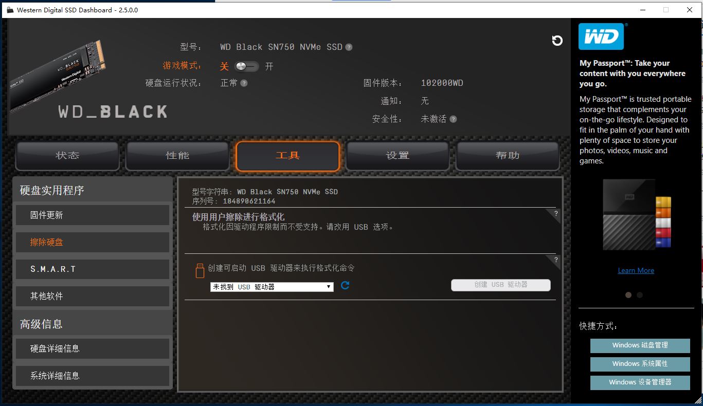 西部数据SN750还针对游戏用户专门设置了游戏模式开关——WD_BLACK SSD Dashboard, 这是西部数据专为最新的这个系列产品专门打造的一款硬盘管理软件,软件功能非常强大,用于分析SSD(包括型号,容量,固件版本和SMART属性)和固件更新,帮助用户在Windows操作系统中保持WD SSD的最佳性能。