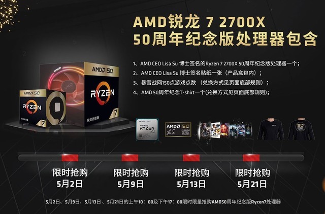 AMD 50周年推出的AMD锐龙7 2700X 50周年纪念版处理器是一款非常具有时代意义且收藏价值很高的处理器产品,所以在数量上少之又少,所以对于已经结束的前两波抢购来说,第三波的预约抢购将会让广大用户们非常激动,用户们要在5月13日抓住机会,争取把这款50周年纪念版处理器收入囊中。