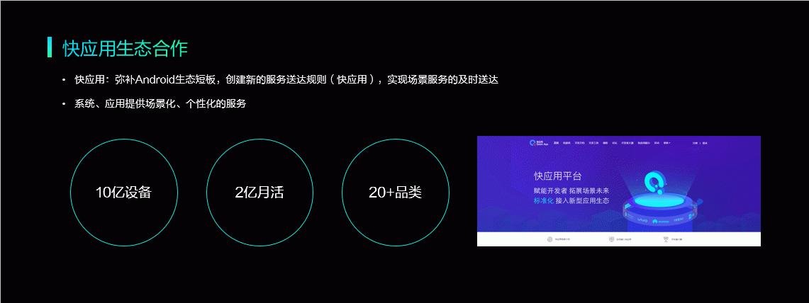 ●Jovi 2.0目前已和携程、百度、支付宝、高德等重要合作伙伴展开深度合作,成功接入20多个品类,支持上千种的服务,为用户提供智慧服务。 ●vivo针对vivo ART++Turbo编译增强技术大幅提升性能和APP的响应速度,冷启动速度平均提升19%,比行业平均水平提升30%,热启动速度较优化前平均提升5%,较行业平均水平提升22% ●快应用联盟的设备已经拥有10亿基数,服务品类超过了二十多种,用户数量达到了2亿的月活指标。 ●vivo计算加速平台(VCAP)助力开发者将算法快速部署、高效运行,全平台通用适配支持,创造更优用户体验