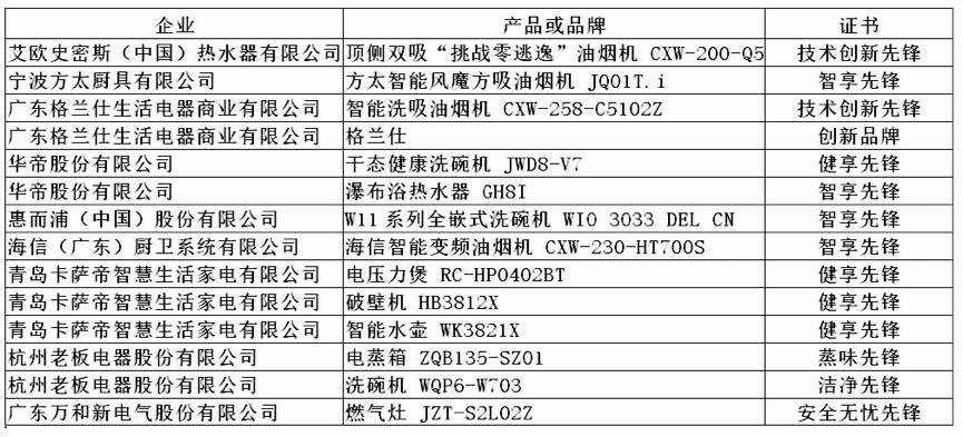 为引导行业规范发展,并指导消费者科学选购,论坛期间,中国家用电器研究院对引领厨电行业品质潮流的“先锋”产品和企业进行了表彰。(以下排名不分先后)