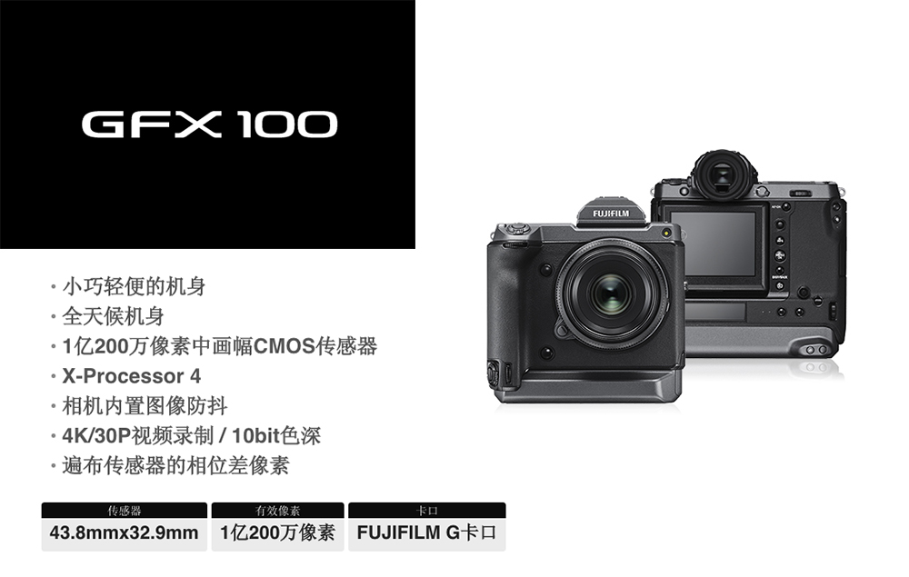新款图像传感器与读取速度快、性能强悍的第四代“X-Processor 4”图像处理引擎相得益彰,支持16-bit RAW模式,可将文件转换为16-bit TIFF,为照片数据的后期处理留下充足空间,满足了专业摄影师的多样化需求。在35mm画幅以上无反数码相机中推出支持4K30p视频录制(外录10bit 4:2:2,内录10bit 4:2:0)。还支持高效的H.265/HEVC编解码器,并以具有宽动态范围伽马曲线的“F-Log”和“Hybrid Log Gamma”(HLG)格式轻松录制HDR视频。