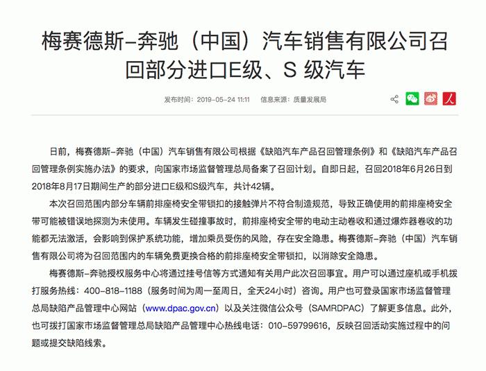 5月24日,国家市场监督管理总局缺陷产品管理中心发布《梅赛德斯-奔驰(中国)汽车销售有限公司召回部分进口E级、S级汽车》,宣布奔驰召回42辆汽车。召回范围为2018年6月26日到2018年8月17日期间生产的部分进口E级和S级汽车,换言之就是出厂尚不足1年的全新进口车?召回原因,是因为部分车辆前排座椅安全带锁扣的接触弹片不符合制造规范,导致正确使用的前排座椅安全带可能被错误地探测为未使用。车辆发生碰撞事故时,前排座椅安全带的电动主动卷收和通过爆炸器卷收的功能都无法激活,会影响到保护系统功能,增加乘员受伤的风险,存在安全隐患。奔驰将免费更换合格的前排座椅安全带锁扣。