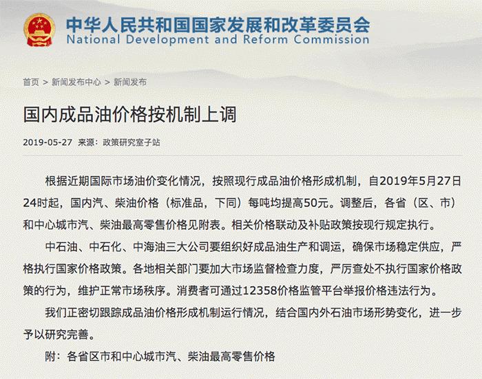 5月27日,据国家发改委消息,新一轮成品油调价窗口将于今天(5月27日)24时开启,价格将迎来小幅上调。本次调价是2019年国内成品油调价窗口出现的第八次上调。根据国家发改委价格监测中心监测,本轮成品油调价周期内(5月13日—5月24日),国际油价先升后降,总体较上轮调价周期变化不大。尽管以美元计价的国际油价变化较小,但考虑到同期人民币对美元汇率贬值因素,国内汽油、柴油零售价格仍会小幅上调。本次油价调整具体情况如下:汽油、柴油每吨均上调50元。全国平均来看,92号汽油、95号汽油、0号柴油每升均上调0.04元。