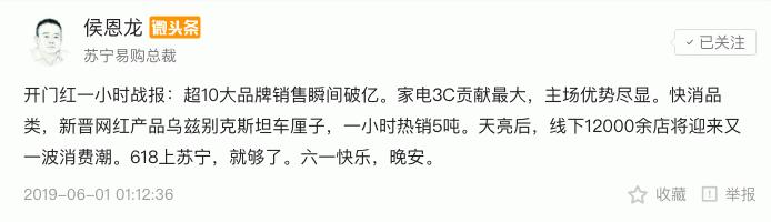 6月1日凌晨,苏宁易购总裁侯恩龙在微头条上公布了苏宁开门红一小时战报:“超10大品牌销售瞬间破亿。家电3C贡献最大,主场优势尽显。快消品类,新晋网红产品乌兹别克斯坦车厘子,一小时热销5吨。天亮后,线下12000余店将迎来又一波消费潮。”