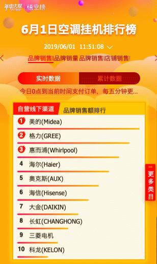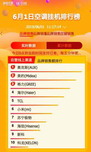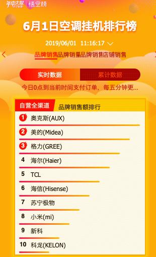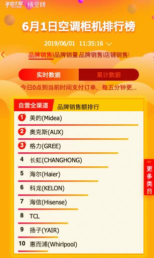 从6月1日0点开始,空调柜机排行榜上,实力派美的早早占据了苏宁自营全渠道与自营线上渠道销售的第一名,奥克斯、格力紧追其后。