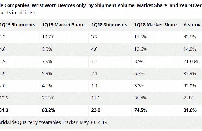 值得注意的是,IDC发布的Q1腕上可穿戴设备报告显示,小米手环以530万台的出货量登顶全球腕上可穿戴设备(wrist worn devices)市场第一,苹果则以460万台的出货量居次席;华为以390万台的出货量排第三。