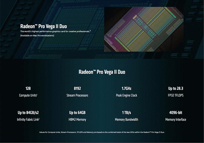 6月4日,AMD宣布推出Radeon Pro Vega II和Radeon Pro Vega II Duo显卡,并在新款Apple Mac Pro工作站上首次亮相。Radeon Pro Vega II基于7nm“Vega 20”MCM的增强型,拥有4096个流处理器,1.70 GHz峰值时钟频率,32GB 4096位HBM2内存。具有PCI-Express 3.0 x16和InfinityFabric接口。Radeon Pro Vega II系列专为专业用途而设计,并为几乎所有专业内容创建应用程序提供认证。Radeon Pro Vega II Duo是一款双GPU显卡。该卡专为Mac Pro而设计(仅适用于苹果工作站),可在单个PCB上放置两个“Vega 20”MCM,每个MCM具有32 GB HBM2内存。使用桥接芯片将两个GPU连接到系统总线,两个GPU之间进行84.5GB/s InfinityFabric链路,用于快速内存访问。
