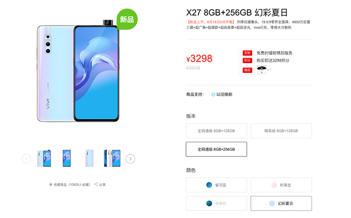 6月10日,vivo宣布X27幻彩夏日版上架,8+128版本2998元,8+256版本3298元。6月18日开启预售。vivo X27幻彩夏日版背面呈现出淡淡的青色和紫色,充满夏日气息。配置与其他版本一致,采用6.39英寸19.5:9零界全面屏,分辨率2340×1080,屏占比91.6%,集成第六代屏幕指纹技术HD版,传感器感应区域面积增加1倍,干手指、低温等特殊场景识别率提升50%。正面采用Invisible隐藏美学设计核心理念,前置摄像头、屏幕边框、受话器、环境光传感器、红外距离传感器等都隐藏于机身之内。升降式摄像头升起速度快至0.68秒,左右两侧增加了两条半透明导光带,机身内部隐藏两颗LED灯,可通过设置显示6种色彩。后置三颗摄像头,主摄是索尼IMX586 4800万像素,搭配超大广角1300万像素、景深辅助500万像素,前置则是1600万像素摄像头。