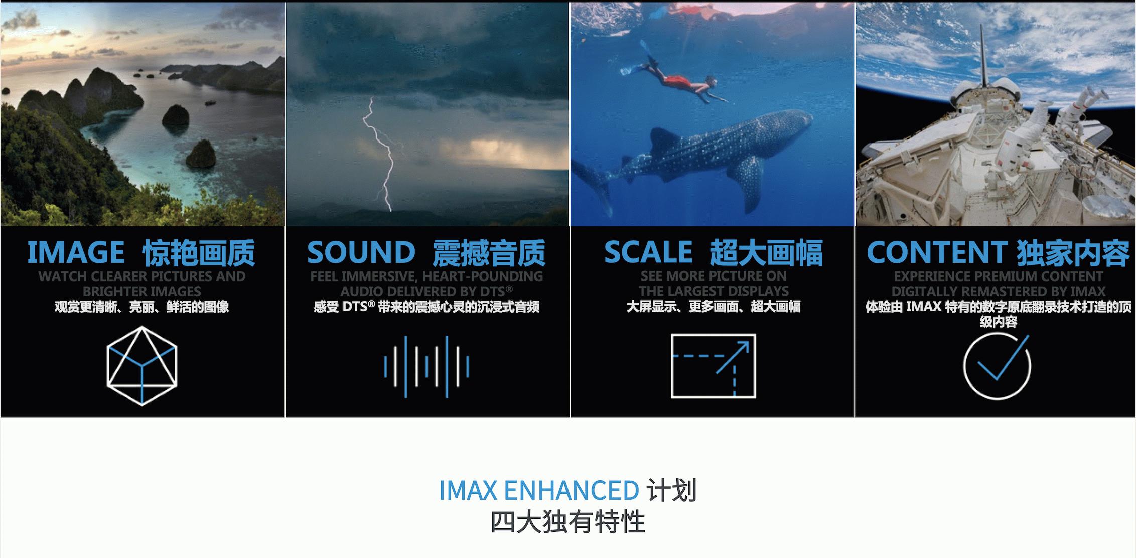 据介绍,IMAX Enhanced认证涵盖了惊艳画质、震撼音质、超大画幅和独家内容这4个特性。IMAX、DTS和好莱坞顶级调色师共同制定了严格的认证规范,以达成“优质设备、清晰画质、完美音效”。