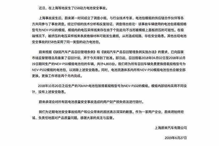 日前,上海蔚来汽车有限公司根据《缺陷汽车产品召回管理条例》和《缺陷汽车产品召回管理条例实施办法》的要求,受委托向国家市场监督管理总局备案了召回计划。自2019年6月27日起,召回部分搭载了2018年4月2日到2018年10月19日期间生产的动力电池包的蔚来 ES8电动汽车,共计4803辆。本次召回范围内车辆使用的动力电池包搭载了规格型号为NEV-P50的模组,模组内的电压采样线束存在走向不当的情况,可能被模组上盖板挤压,导致被挤压的电压采样线束表皮绝缘材料磨损,极端情况下可能造成线束绝缘层烧损从而引起电池包热失控和起火,存在安全隐患。蔚来将为所有召回车辆免费更换搭载规格型号为NEV-P102模组的电池包,以消除上述安全隐患。同时,电池流通体系内所有NEV-P50模组电池包也会被全部更换。更换工作将在两个月内完成。蔚来承诺会对所有因电池质量安全事故造成的用户财产损失依法进行赔付。