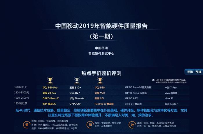 6月27日,中国移动终端实验室发布了《中国移动2019年智能硬件质量报告》(以下简称报告)。报告分别评测了5G芯片性能、5G终端性能、手机摄像头、带屏智能音箱、热点手机、手机游戏能力与智能硬件等。中国移动终端实验室表示,后4G时代,通信技术成熟,质量稳定,终端创新主要集中在外形美观、硬件审计、软件智能化与效率化等方面,尤其注重在特定场景下机制用户体验提升。在热点手机整机评测中,报告分别从观感、影像、娱乐、视觉、听觉等方面进行评测。在1500-2500元价位,OPPO Reno Z位列第一,华为Nova4e、荣耀20i、OPPO A9X、vivo S1分列二至五位。在2500-3500元价位,荣耀20 Pro位列第一,vivo X27、荣耀V20、OPPO Reno标准版、vivo iQOO分列二至五位。在3500元以上价位,华为P30 Pro、三星S10+、华为P30位列前三位,OPPO Reno 10倍变焦版、一加7 Pro分列四、五位。
