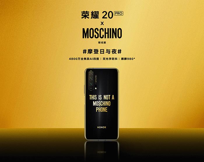 7月1日,荣耀手机官方宣布,将与意大利奢侈品牌MOSCHINO推出联名款荣耀20 PRO手机,7月2日10点08分限量发售。联名款荣耀20 PRO采用黑色配色,标志变为金色。采用“魅眼全面屏”设计,6.26英寸屏幕,分辨率为2340×1080。处理器为麒麟980,最高配备8GB +256GB存储,GPU Turbo 3.0,虚拟9.1环绕声,内置全新EROFS文件系统。配有4000mAh大容量电池,支持22.5W快充。后置相机分别为标准广角(48MP)、超广角(16MP)、长焦(8MP)和微距镜头(2MP)。主摄是IMX 586传感器,镜头光圈达到了F/1.4。