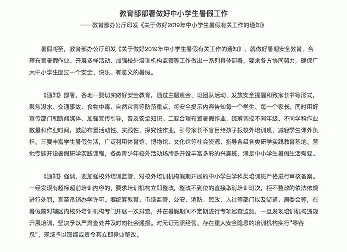 7月2日,教育部办公厅印发《关于做好2019年中小学生暑假有关工作的通知》,就做好暑期安全教育、合理布置暑假作业、开展多样活动、加强校外培训机构监管等工作做出一系列具体部署,要求各方协同努力,确保广大中小学生度过一个安全、快乐、有意义的暑假。 《通知》部署,各地一要切实做好安全教育,通过主题班会、班团队活动、发放安全提醒和致家长书等形式,聚焦溺水、交通事故、食物中毒、自然灾害等防范重点,将安全提示内容告知每一个学生、每一个家长,同时用好宣传部门和新闻媒体,加强宣传引导,普及安全知识。二要合理布置暑假作业,统筹调控不同年级、不同学科作业数量和作业时间,鼓励布置活动性、实践性、探究性作业,引导家长不盲目给孩子报校外培训班,减轻学生课外负担。三要丰富学生暑假生活,广泛利用体育馆、博物馆、文化馆等社会资源,指导各级各类研学实践教育基地、营地专题开设暑假研学实践课程,各类青少年校外活动场所多开设丰富多彩的兴趣班,满足中小学生暑假生活需要。 《通知》强调,要加强校外培训监管,对校外培训机构假期开展的中小学生学科类培训班严格进行审核备案。一经发现有超标超前培训内容的,要求培训机构立即整改,整改不到位的直接取消培训班次,拒不整改的依法依规进行处罚,直至吊销办学许可。要统筹教育、市场监管、公安、消防、民政、人社等部门以及街道、居委会等,在暑假前对辖区内校外培训机构专门开展一次排查,并在暑假期间不定期进行专项巡查监测,一旦发现培训机构违规开展培训,坚决予以严肃查处并及时向社会通报。对无证无照经营、存在重大安全隐患的培训机构实行“零容忍”,现场予以取缔或责令其立即停业整改。