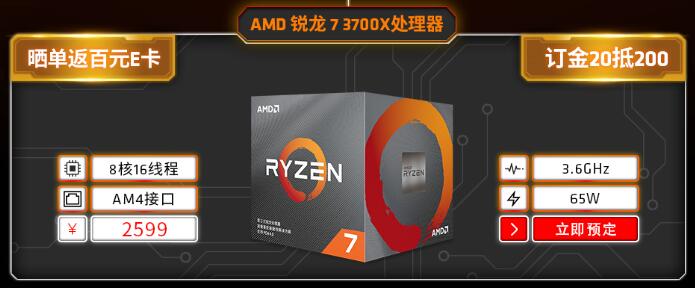 定金膨胀:凡是在预售期间成功预订3700X处理器且支付定金20元的用户,将在支付尾款时抵扣尾款200元(7月3日0:00-7月7日23:30)
