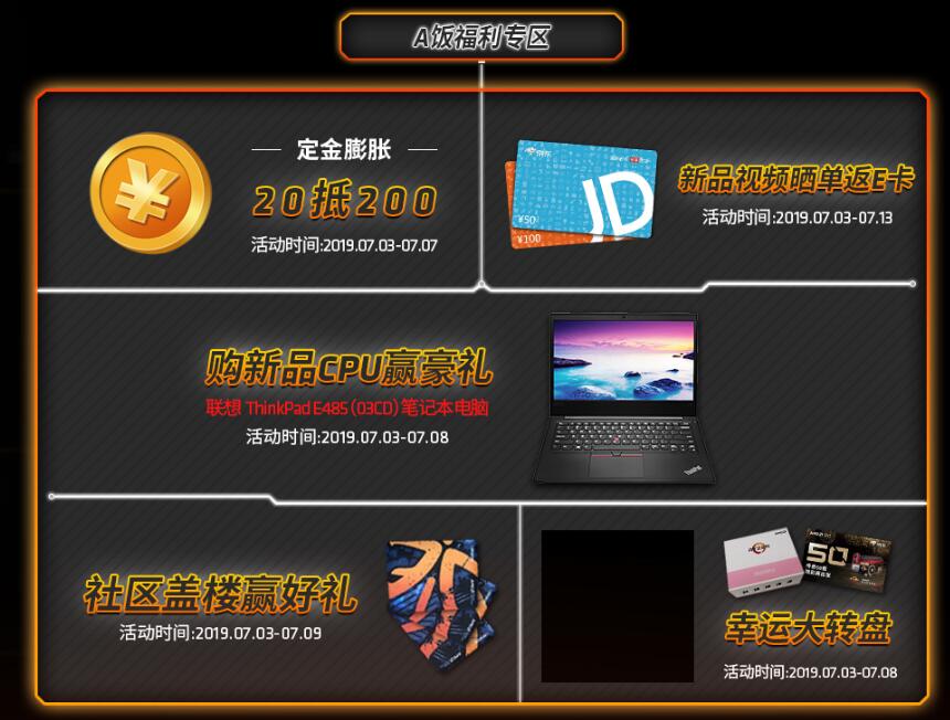 购新品CPU赢豪礼:凡是在7月3日—7月8日关注AMD京东自营旗舰店和购买指定型号产品并晒单评论的用户就有机会赢取ThinkPad E485笔记本等超值大奖。
