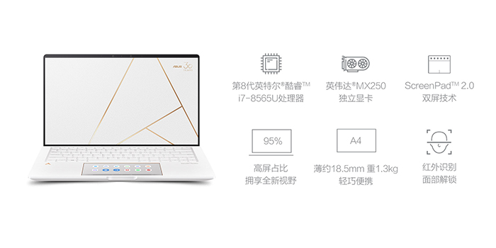 7月3日,华硕ARTONE 18k金镀金工艺轻奢本开启预售,售价14999元,预计7月11日发货。ARTONE 18k金镀金工艺轻奢本采用意大利头层牛皮,50+皮革制作工序,18K玫瑰金纳米电镀工艺。尺寸为30.2x18.9x1.85cm,重约1.2kg。配置方面,搭载第八代智能英特尔酷睿i7处理器(i7-8565U),采用16GB LPDDR3内存和1TB固态硬盘,显卡为英伟达MX250(2GB)。采用95%屏占比的13.3英寸屏幕,可视角度为178度。搭载ScreenPad 2.0双屏技术,可以将手机投屏至触摸板屏幕,支持红外识别面部解锁。机身底部采用ErgoLift转轴设计,当使用时机身抬高约3度。此外,可享整机三年质保,整机两年国际联保和电池一年质保服务。