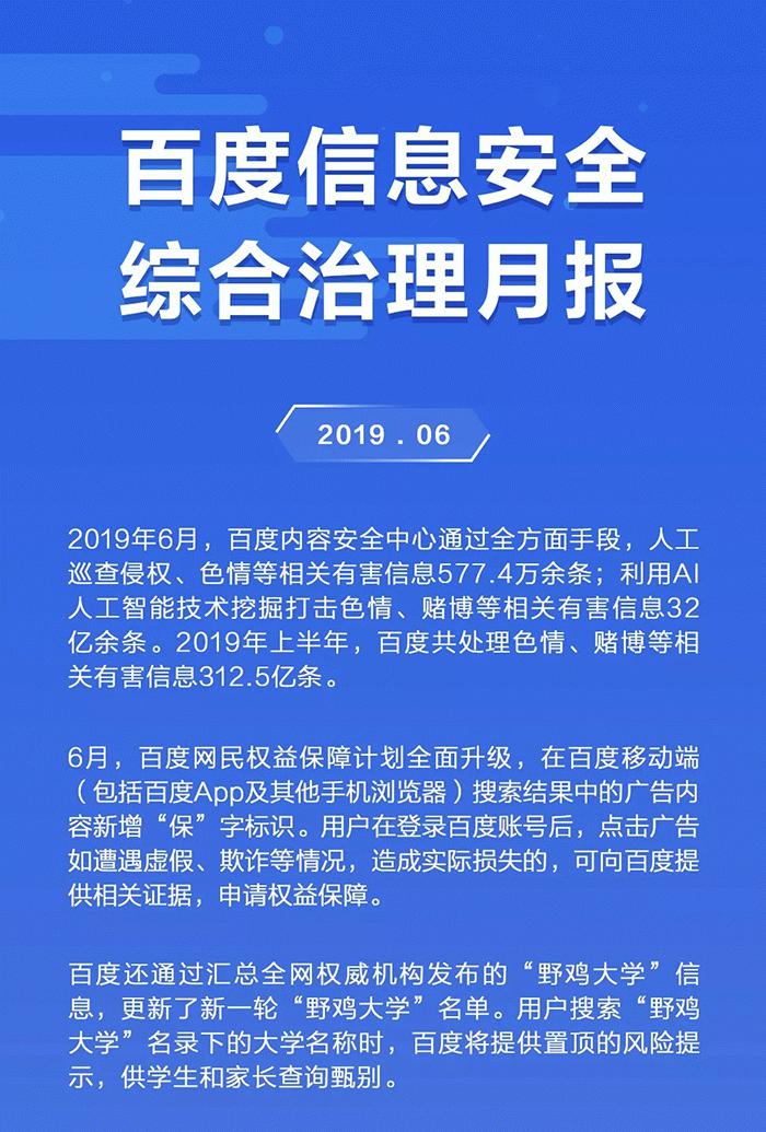 为了持续向大家分享百度在处理网络虚假有害信息、保护网民权益方面的相关行动和信息,近日,百度发布6月信息安全综合治理月报。报告显示,2019年6月,百度内容安全中心通过全方面手段,人工巡查侵权、色情等相关有害信息577.4万余条;利用人工智能技术挖掘打击色情、赌博等相关有害信息32亿余条。在网络推广方面,百度6月下线不合规广告2.23亿条,拒绝医疗变体词5000万个,比上月增长超过40%。此外,百度网民权益保障计划全面升级,在百度移动端(包括百度 APP 及其他手机浏览器)搜索结果中的广告内容新增“保”字标识。用户在登录百度账号后,点击广告如遭遇虚假、欺诈等情况,造成实际损失的,可向百度提供相关证据,申请权益保障。