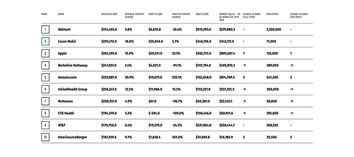 北京时间2019年7月22日,《财富》发布最新的世界500强排行榜。从数量上看,有129家企业来自中国,历史上首次超过美国(121家)。即使不计算台湾地区企业,中国大陆企业(包括香港企业)也达到119家,与美国数量旗鼓相当,这是一个历史性的变化。与上年相比,今年上榜500家公司的总营业收入近32.7万亿美元,同比增加8.9%;总利润再创纪录达到2.15万亿美元,同比增加14.5%;净利润率则达到6.6%,净资产收益率达到12.1%,都超过了去年。沃尔玛连续第六年成为全球最大公司,中国石化位列第二,壳牌石油上升至第三位,中国石油和国家电网分列第四、第五位。今年上榜的互联网相关公司共有7家,除新上榜的小米外,其余6家排名较去年均有提升,分别为来自中美两国的京东、阿里巴巴、腾讯、亚马逊、谷歌母公司Alphabet和Facebook。