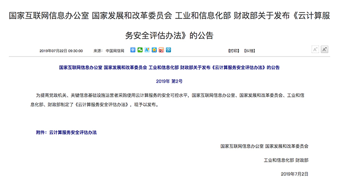 四部委联合发布《云计算服务安全评估办法》