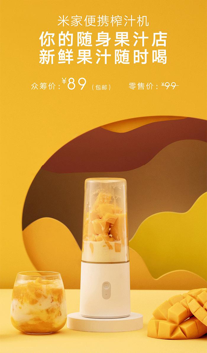 7月31日,米家便携榨汁机正式上架小米商城开启众筹,正式售价为99元,众筹特惠价仅89元。继承“Mi-Look”设计语言,米家便携榨汁机采用简洁的白色底座,350ml杯身设计,均为食品级安全材质。4叶精钢刀搭配高速电机,动力更强劲,杯量为350ml,连按两下开关开始搅打,40秒便能做出一杯鲜榨果汁。米家便携榨汁机整体大小和重量与保温杯相近,可轻松放入包内、行李箱内等。电池容量为2000mAh,充满电仅需2小时。满电情况下可榨出15杯果汁,支持移动电源充电。此外,还附带自清洗功能。用户只需在杯中装适量清水,扣紧底座,连按两下开关,杯内就会自动形成水龙卷,进行自清洗,清洗时长为40秒。