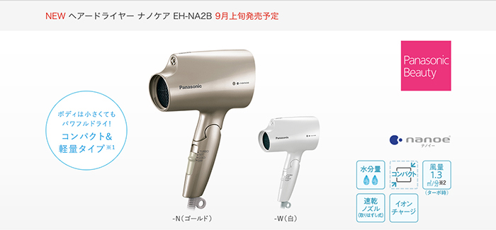 而紧凑型的EH-NA2B尺寸最小巧,157X79X217mm(宽X深X高),重量仅约为475g。配有快干喷嘴,具有静电抑制功能,其风量有TURBO、SET、COLD三个阶段,热风温度约为110℃。