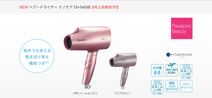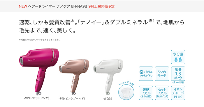 高端型号EH-NA9B最大特点是拥有两个锌电极产生的矿物质负离子,可以与nanoe协同作用于角质层,从而形成更为顺滑柔润的头发。此外,它还具有紫外线护理效果,能抵抗紫外线和摩擦损伤的头发。其风量有TURBO、DRY、SET三个阶段,可以将温度切换为HOT(约125℃)/ SCALP(约60℃)/冷。另外,它还配备了静电控制、温冷节奏模式、毛发集中护理模式等。