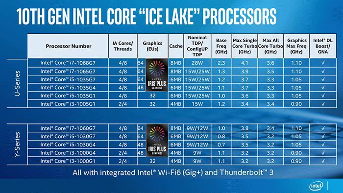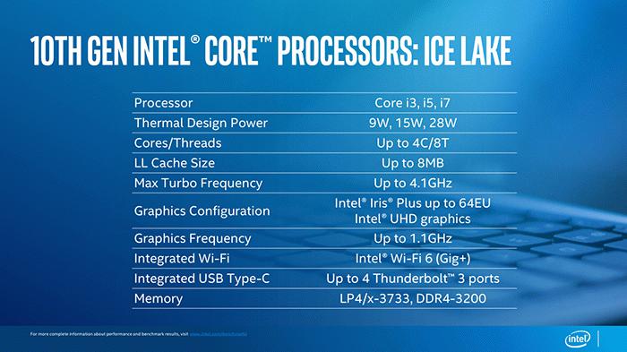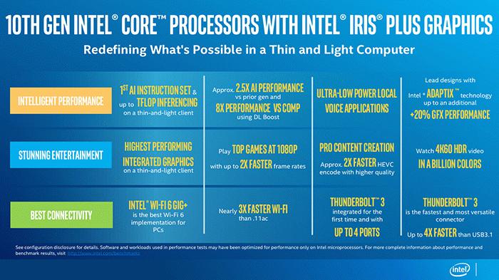 Ice Lake十代酷睿是Intel第一批大规模采用10nm工艺的产品,同时拥有全新设计的Sunny Cove CPU架构、11代GPU核芯显卡架构,也是PC处理器第一次大规模集成和应用AI人工智能,还支持Wi-Fi 6(Gig+)、雷电3接口。