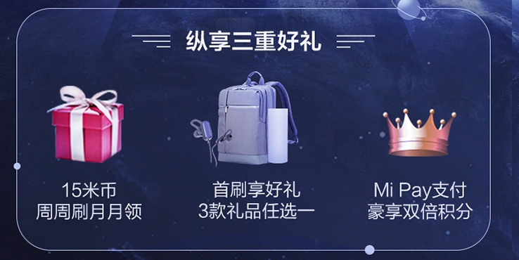 除了神秘酷炫的卡面设计,招行小米信用卡还为用户带来了专属权益福利。招商银行信用卡新用户申请并完成首刷,即可领取以下礼品(三选一):小米双肩包、蓝牙耳机、米家保温杯,领取后可在小米商城APP免费兑换。又如快捷支付礼,新户每月任意三周刷卡达标,叠加领取15米币;还有Mi Pay双倍积分,通过Mi Pay或小米钱包,支付享受双倍积分特权。在年费上,个人版首年免年费,校园版持卡有效期内无附加条件免年费。