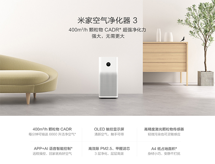 8月9日,米家空气净化器3在小米商城上线,定价899元。和上一代产品相比,米家空气净化器3的风路系统被重新设计,在不改变机身体积的前提下可以输出更大风量,每分钟可以输送6660L洁净空气,将CADR值提升至400m3/h,PM2.5净化能力提升29%。突破同体积塔式净化能力的极限。运行噪音地址32.1dB(A),运行最大功率仅38W,适用面积提升了11㎡,最大可达48㎡,基本可以满足小户型家庭全屋的使用需求。内置微米级激光颗粒传感器,可以探测微米级别细小颗粒,实时反馈室内空气质量变化,开启自动模式的净化器也会随之主动调整,获得更佳的净化效果。圆形OLED显示屏幕,可以提供室内空气数据(温度、湿度、实时PM2.5数值)、净化器运行状态、网络连接状态等信息。风速调节功能,在原有的最爱挡、睡眠挡、自动挡之外还有低速、中速、高速三重固定挡位,给用户更多选择空间。