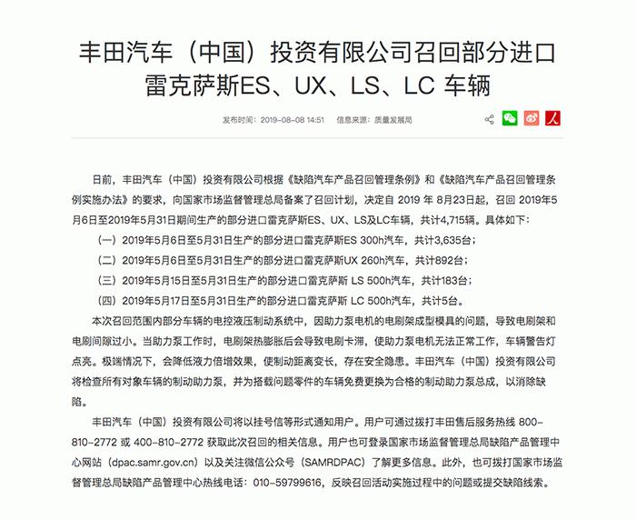 日前,丰田汽车(中国)投资有限公司根据《缺陷汽车产品召回管理条例》和《缺陷汽车产品召回管理条例实施办法》的要求,向国家市场监督管理总局备案了召回计划,决定自 2019 年 8月23日起,召回 2019年5月6日至2019年5月31日期间生产的部分进口雷克萨斯ES、UX、LS及LC车辆,共计4,715辆。本次召回范围内部分车辆的电控液压制动系统中,因助力泵电机的电刷架成型模具的问题,导致电刷架和电刷间隙过小。当助力泵工作时,电刷架热膨胀后会导致电刷卡滞,使助力泵电机无法正常工作,车辆警告灯点亮。极端情况下,会降低液力倍增效果,使制动距离变长,存在安全隐患。丰田汽车(中国)投资有限公司将检查所有对象车辆的制动助力泵,并为搭载问题零件的车辆免费更换为合格的制动助力泵总成,以消除缺陷。