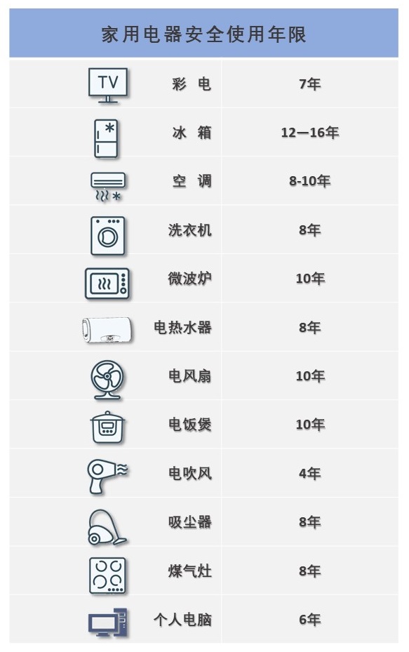 超期服役的电器产品,普遍存在电器元件电线老化,会造成原有功能退化、辐射增大、易引起火灾、漏电等危害,不仅威胁到使用者的安全、健康,同时也对环境造成一定的污染。此外,一般高龄家电的耗电量要超过原耗电量的40%,易造成额外的资源浪费。看到家电超期服役有这么多安全隐患是不是有些胆颤心惊?赶紧检查一下您家里的家用电器是否已经超期服役,老旧家电该换就换,不要让它们成为我们身边的“不定时炸弹”!