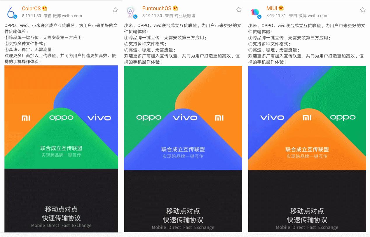 8月19日,OPPO、vivo、小米(注:排名不分先后,按首字母排序)三大手机厂商携手成立“互传联盟”,旨在以系统级的“互通”,发挥三大品牌互传功能的优势,为用户带来比蓝牙、Wi-Fi传输更加便捷、安全的文件传输体验,据悉,三大品牌打通后的互传功能都将在近期开始公测。