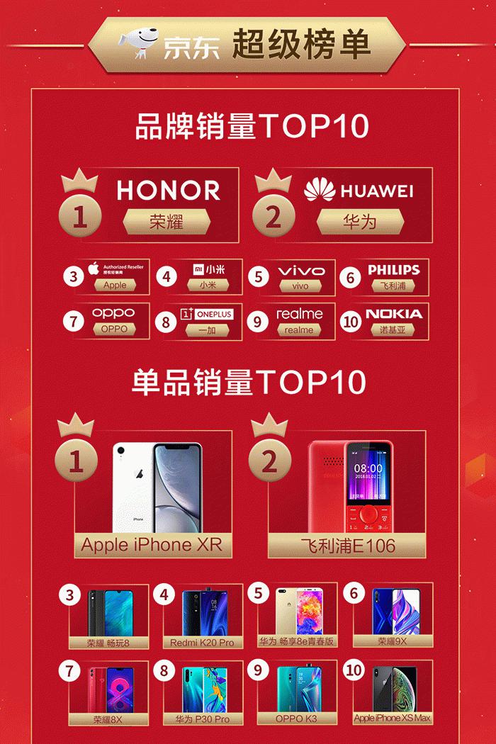 8月20日,京东公布了京东818手机节战报。战报显示818当天,京东成交金额为近30天日均的2.6倍,成交金额打破手机超级品类日历史记录。其中京东818手机品牌销量TOP 10分别为荣耀、华为、苹果、小米、vivo、飞利浦、OPPO、一加、realme、诺基亚。京东818手机单品销量TOP 10分别为iPhone XR、飞利浦E106(值班功能机)、荣耀畅玩8、红米K20 Pro、华为畅享8e、荣耀9X、荣耀8X、华为P30 Pro、OPPO K3、iPhone XS Max。京东818品牌成交额TOP 10分别为苹果、华为、小米、荣耀、一加、vivo、OPPO、三星、realme、黑鲨手机。