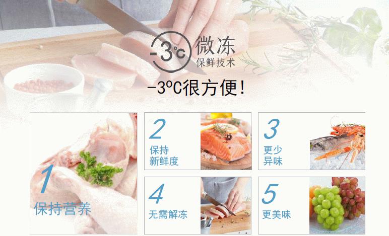 与零度保鲜不同,-3°C微冻保鲜仅使食物表面稍微冻结,不会损伤食物细胞,解冻时基本不会有血水、汁水溢出,最大限度保留生鲜食物的营养和口感,可以在有效时间内,保证肉质食物的美味不流失。同时用户使用肉质食材前不必解冻,节省烹饪时间。与冷藏相比,可以实现更持久的保鲜效果;与冷冻相比,则能够更好地维持美味度。