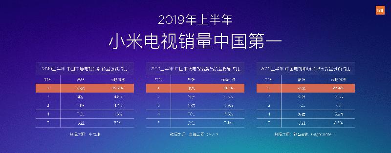 8月29日,在北京小米科技园举办的 Redmi新品发布会上,小米集团副总裁、红米Redmi品牌总经理卢伟冰发布了Redmi首款电视产品——Redmi红米电视70英寸。根据中怡康、奥维云网、群智咨询三大调研机构统计,小米电视取得了2019上半年销量中国第一的成绩。