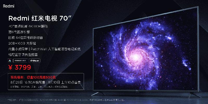 8月29日下午, Redmi红米电视70英寸开启预约/预售,9月10日10点正式开售,同步登陆小米商城、小米有品、京东、天猫、苏宁易购。值得一提的是,此轮首卖预售还为米粉准备了特享福利:订金100元抵500元,这意味着Redmi红米电视70英寸的首卖到手价仅为3399元。相信这款性价比爆表的巨屏电视,将掀起一场巨屏电视普及风暴。