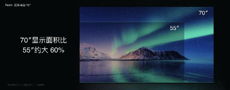 “同样的钱买更大的!” 卢伟冰表示。因此,Redmi红米电视首款产品便采用70英寸4K超高清巨屏设计,其显示面积比目前的主流尺寸55英寸大出约60%,巨大的视野为用户带来更震撼的沉浸感。