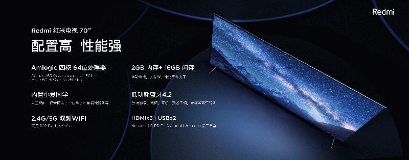 Redmi红米电视70英寸,整体外观简约大气,钢琴烤漆质感的边框时尚雅致,磨砂金属工艺的底座纤细而又坚固,配合70英寸巨大屏幕,带来与众不同的视觉冲击力,稳占客厅C位;配置方面,采用Amlogic第六代画质引擎,搭配10余项画质增强技术,展现画面丰富细节;独立腔体音箱,声音大、低音沉、音域广;搭载四核64位高性能处理器,2GB+16GB大容量存储,2.4G/5G双频WiFi,确保在家中任何一个位置都能流畅播放在线视频。