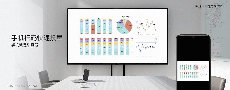 Redmi红米电视70英寸也适用于办公场合。相比较“见光死”的投影机,LCD显示技术透亮的屏幕显示效果,换来的是更轻松愉悦的办公场景;并彻底摆脱了传统办公会议中投影机、转接头、HDMI线头、翻页器构成的复杂“线”制,大大提升办公效率。
