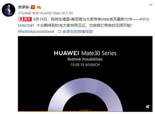 【小熊在线网 新闻报道】9月1日下午,华为消费者业务CEO余承东在其个人微博,释放了全新预热视频,配以“9月19日,我将在德国•慕尼黑为大家带来Mate系列最新力作——#华为Mate30#!十分期待到时与大家共同见证,它给我们带来的无限可能!