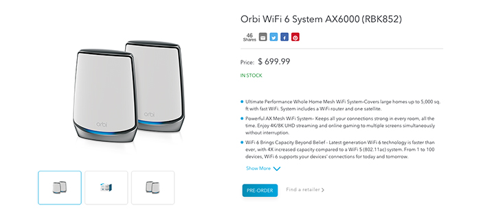 在IFA 2019国际电子消费展上,NETGEAR正式发布了全球首款WiFi 6 Mesh路由器Orbi WiFi 6,具体型号为RBK852。Orbi RBK852采用了性能更强的WiFi 6规格,网络规格升级为4x4 MU-MIMO,设备容量也有明显的提升。Orbi RBK852基于高通的Networking Pro 1200平台打造,拥有一个主频为2.2GHz的四核心处理器,配置有512MB的NAND闪存与1GB容量的内存,有1个2.5Gbps的WAN口和4个千兆LAN口。套装内的两台路由器通过速率为2.4Gbps的4x4 MU-MIMO 5GHz WiFi 6网络进行连接,同时还扩展出4x4 MU-MIMO的2.4GHz与5GHz网络,理论速率为1.2Gbps+2.4Gbps,有效带机量可达到100台以上,可同时支持超过20条数据流。