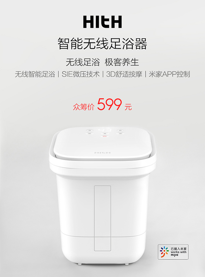 9月7日,HITH智能无线足浴器Q2上架小米众筹,市场价799元,众筹价599元。HITH智能无线足浴器Q2采用有线加热充电,无线足浴按摩的方式,13组大容量锂电模块,一次充电可享受长达100分钟的足浴按摩,客厅、书房、卧室、阳台无忧无束。HITH创新的SIE微感应电技术,足浴按摩时锂电池低压供电,搭载智能电池管理系统,实时监控保护每一颗电芯的安全。盆体底部采用倾斜设计,在保证内部使用长度不变的情况下大幅减小整机的长度,整体占地面积只有0.1㎡。16颗自动旋转按摩球,如真人般按摩脚底穴位和反射区,专属定制3种智能足浴模式。支持米家APP,可通过APP先8动加热,回家即可享受足浴SPA。