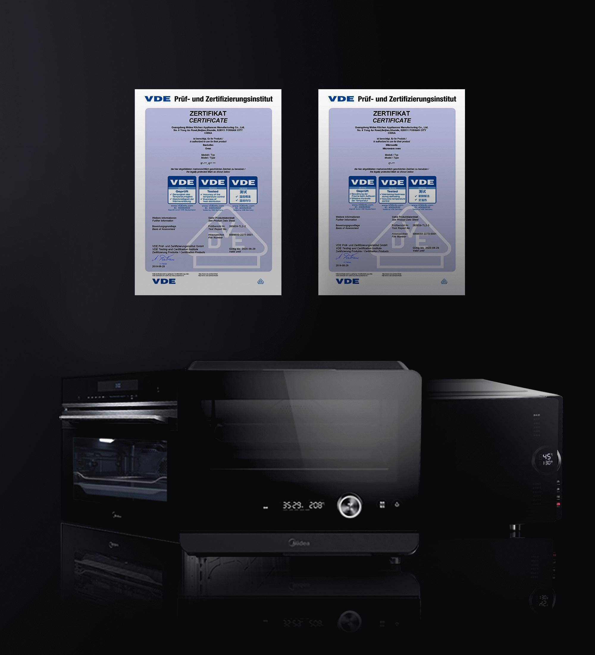 2019年9月德国IFA展上,欧洲最权威的认证机构VDE(即德国电气工程师协会)将电气界两张极具含金量的证书——微波炉“定温热”和蒸烤箱“温控精准”技术认证颁发给了美的微波与清洁电器事业部。被誉为全球电气界的“诺贝尔”的VDE技术认证,双证同时花落美的微清事业部。此举证明了美的微清的产品技术水平,已引领行业,拥有了让全球用户值得信赖的国际领先水平。
