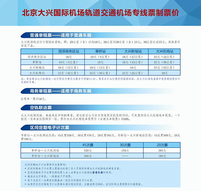 9月30日,北京大兴机场将正式启用,这将是全世界最大空港的、被英国《卫报》评为“新世界七大奇迹”之首,多家航空公司届时会转向这座机场。9月15日,北京城市铁建轨道交通投资发展有限公司宣布了大兴国际机场轨道交通机场专线票制票价。普通车厢采用计程限时票制,20公里内(含)票价10元,20到30公里内25元,30公里以上35元。商务车厢统一票价为50元。如果是空轨联运乘客,那么购买机票的时候可以按照票价80%的价格购买机场专线车票。还一种就是期间定期电子计次票,分为20次、30次及45次三种,有草桥站-大型机场站、草桥站-大兴新城站两个区间,最低180元,最高550元。