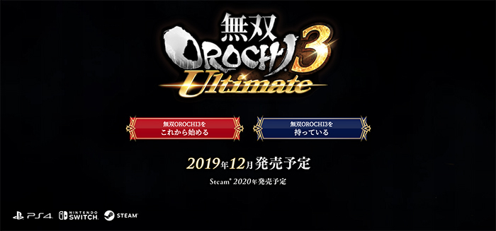 在2019东京电玩展上,KOEI TECMO GAMES正式宣布《无双大蛇3:终极版》将于2019年12月19日发售PS4/Switch平台版,PC版2020年2月14日发售,价格为7800日元+税,数字版专卖升级包价格为4800日元。本作将加入以盖亚为首的新角色,还有贞德等系列人气角色再次参战,目前已知的新角色有冥王哈迪斯、阿喀琉斯登场,前作170名以上角色均将参战。值得一提的是,本作还有一首由新角色cv早见沙织演唱的全新主题曲。《无双大蛇3:终极版》还将追加终极模式“无限模式”和进一步的强化系统“转生”等,打造出究极武将。