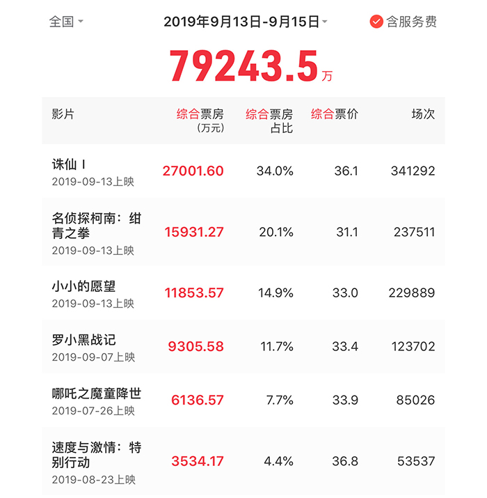 9月16日,猫眼发布2019年中秋档电影盘点。根据猫眼专业版数据显示,2019年中秋档(9.13-9.15)总票房7.92亿,同比增长49.19%;观影总人次2342万,同比增长53.56%。同时7.92亿的总票房创造档期票房新高,9月13日单日票房3.65亿也是中秋档单日票房新高。《诛仙Ⅰ》三日票房2.70亿拿下档期冠军,假期首日1.42亿在中秋档历史上也是单片单日第三高的票房。亚军《名侦探柯南:绀青之拳》假期三天票房1.59亿,用时三天就超越了去年《名侦探柯南:零的执行人》的1.27亿、创造系列电影票房新高。季军《小小的愿望》假期三天票房1.18亿,累计票房1.48亿。此外,《罗小黑战记》假期三天再入9305万,累计票房2.29亿,位居2019年动画电影票房第7位;《哪吒之魔童降世》假期三天票房6136万,累计票房48.96亿,最快将于今日解锁49亿。中秋三天动画电影票房贡献接近40%,整体表现亮眼。