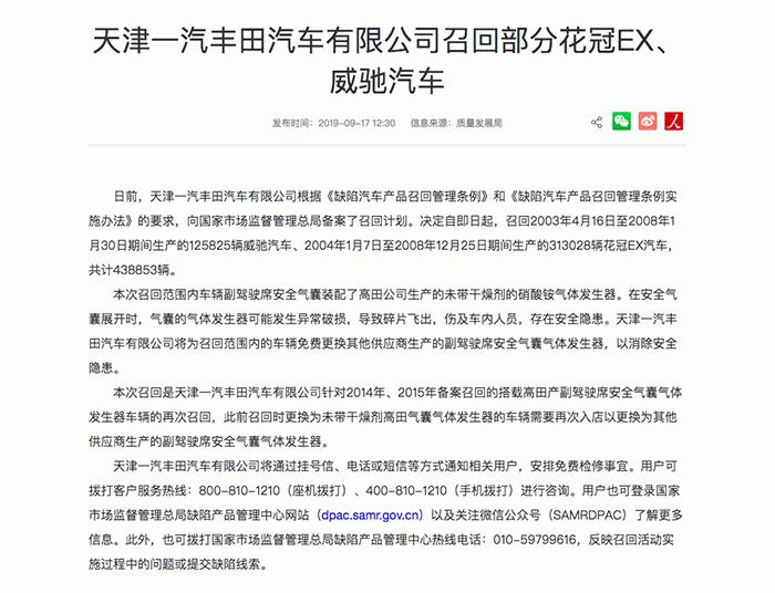 因气囊问题 部分花冠EX和威驰汽车召回