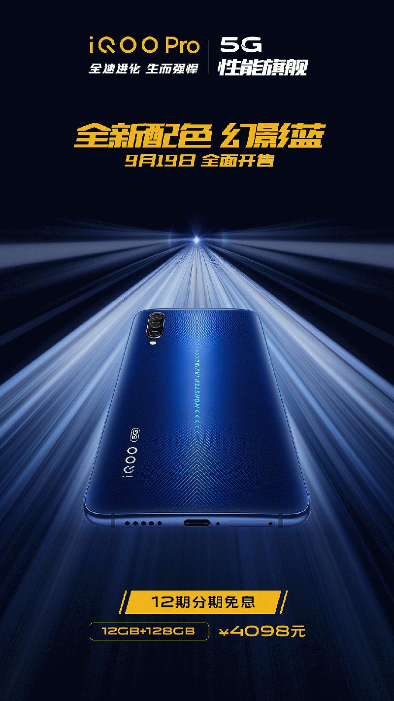 iQOO Pro幻影蓝配色今日正式开售,售价4098元,可享受12期免息分期;